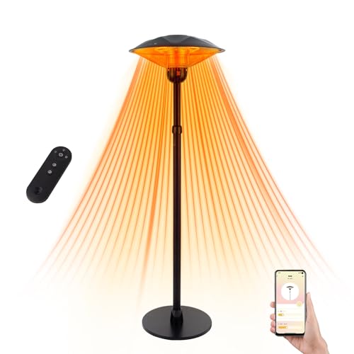 屋外用ハロゲンヒーター、1500Wで360°全方位暖房。高さ調整可能(160-205cm)、3段階温度設定、静音・省エネ設計。IP44防水、転倒防止、過熱保護機能あり。ガーデンやパーティー向け。