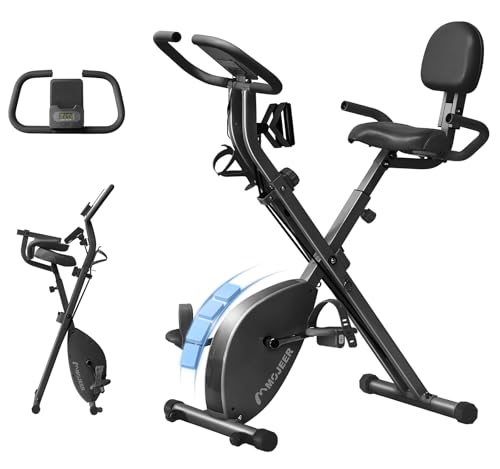 MOJEERフィットネスバイクは、16段階負荷調整と8段調節のサドルを備えた静音折り畳み型トレーニングバイクです。腰部サポートとアームレスト付きで、耐荷重160kg、簡単組立、日本語説明書が付属。