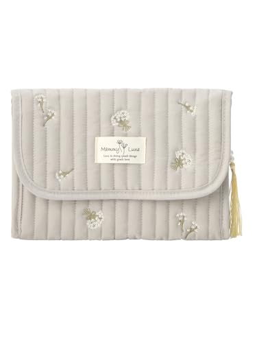 MAMMY LUNAの母子手帳ケースは、イブルヌビキルトで作られた綿100%のマルチケースです。グレー(カスミ草)のデザインで、可愛いだけでなく、機能的な収納が魅力です。