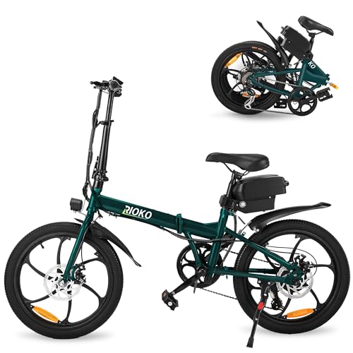 RIOKOの最新電動アシスト折りたたみ自転車は、軽量20kgで公道可。色が変わるデザイン、シマノ7段変速、5段階アシスト、350Wモーター。坂道30度登坂可能、IP64防水、20インチ、着脱式バッテリー、日本語説明書付き。