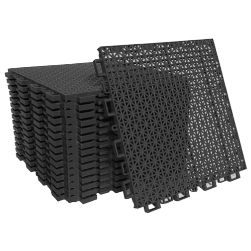 PIKNEW PP材質の耐摩耗性ガレージタイル48枚セット。はめ込み式で工具不要、水はけ効果あり。洗える軽量設計、滑り止め機能付き。サイズ25x25x1.3cm、カラーバリエーションあり。駐車場や屋内外に最適。