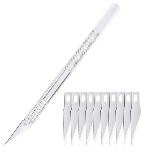 EDu カッターナイフ彫刻ナイフは、キャップ付きで替刃10枚が付属しています。高硬度の替刃式彫刻刀で、手彫り作業に最適。アルミ合金ハンドルを採用し、軽量で扱いやすいシルバーのアートナイフです。