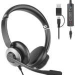 有線マイク付きイヤホン、3.5mm/USB-A/USB-C対応。ノイズキャンセリング、ステレオ音声、音量調節・ミュート機能搭載。軽量設計で快適、オンライン会議やテレワークに最適。カラーはブラックグレー。