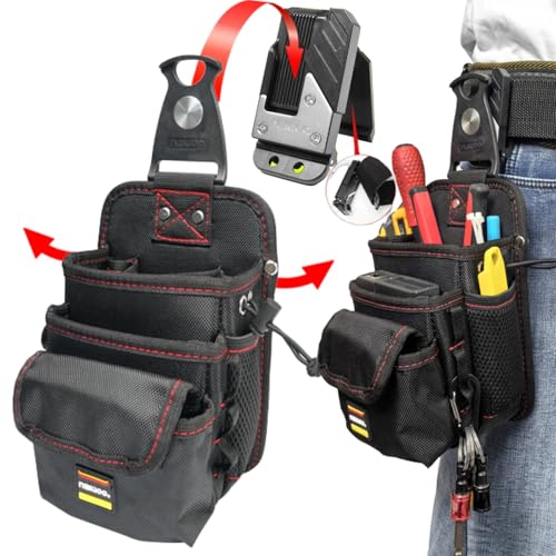 FFYGYNFDEの三段式腰袋は、電動ドリル用の着脱式ホルダー付きで、軽量ナイロン素材を使用。防水で耐久性があり、工具落下防止機能も完備。迅速な着脱と回転フックで便利です。