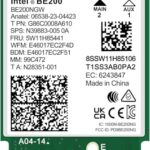 WiFi 7対応のIntel BE200無線LAN M.2カード。最大5.8Gbpsの通信速度、Bluetooth 5.4、6GHz帯利用可。MU-MIMO対応、Windows 10/11専用、AMD非対応。