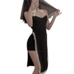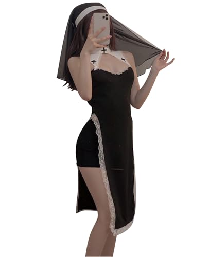 大人用ハロウィンシスターコスプレ。黒のシスター衣装に白のエプロンが特徴。サイズはフリーで、レースアップブーツやハロウィンアクセサリーと合わせると完璧なコーディネートに。パーティーやイベントにぴったり!