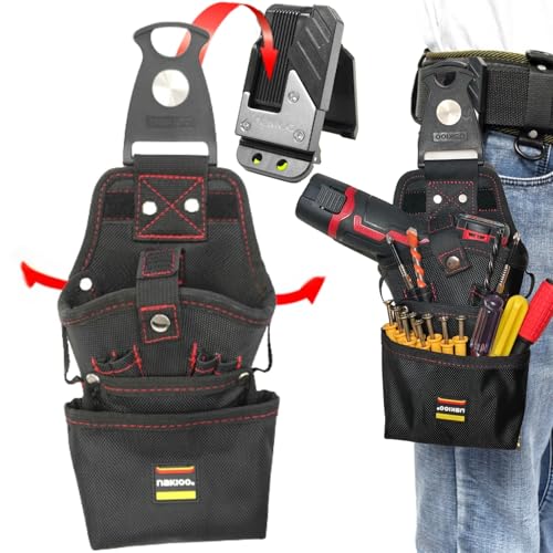 FFYGYNFDEの電動ドリル用腰袋は、3段構造で着脱式ツールホルダー付き。防水・耐久性のある軽量ナイロン素材。快速着脱機能と回転式フックで、電気工事やDIYに最適。
