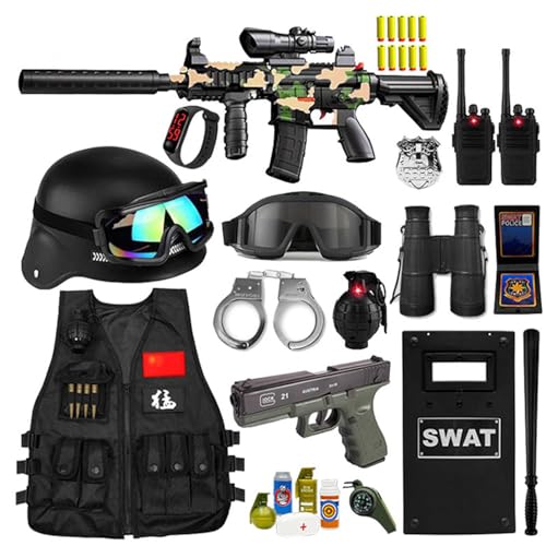 ギトバーゴの子供用SWAT風警察コスチュームセット。16点セットにはベスト、警棒、サングラス、帽子、盾等が含まれ、ハロウィンやごっこ遊びに最適。対象年齢2~5歳で、男女兼用。
