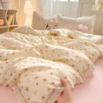 布団カバーセット3点シングルサイズ。かわいい花柄とフリルデザインで、おしゃれな室内にピッタリ。安心・清潔で、肌に優しい素材を使用。丸洗いOKで、シンプルでオールシーズン使えます。