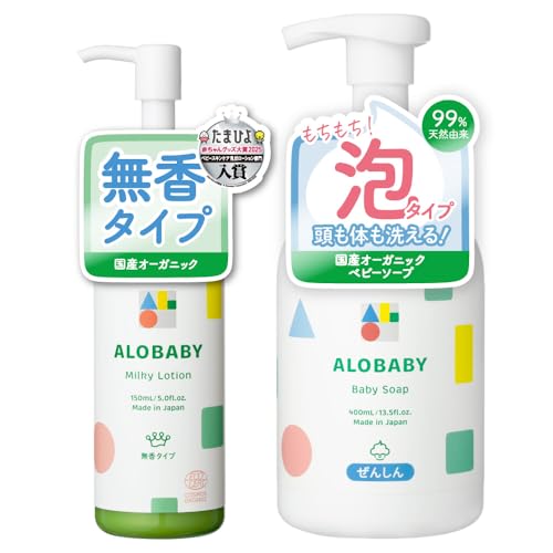 アロベビー オーガニックスキンケアセットは、無香料のミルクローション通常サイズとベビーソープが含まれています。天然成分を使用し、敏感肌の赤ちゃんにも安心して使えるアイテムです。