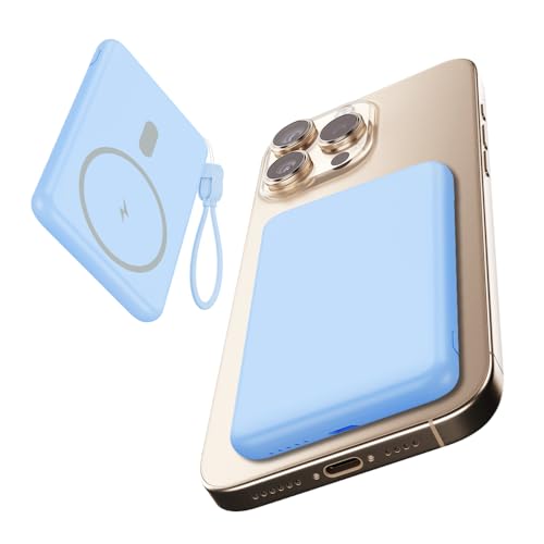 明誠のモバイルバッテリーは6800mAhで軽量かつ薄型。MagSafe対応、15Wのワイヤレス出力とPD20W急速充電が可能。USB-Cポートで2台同時充電、LED残量表示あり。幅広い機種に対応(ブルー)。