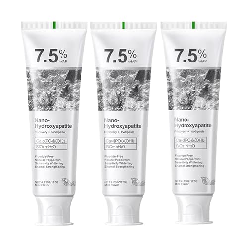 ナノハイドロキシアパタイト7.5%配合のフッ素フリーホワイトニング歯磨き粉。フレッシュミント風味で、歯の着色除去と保護をサポート。毎日のオーラルケアに最適、120gの3本セット。