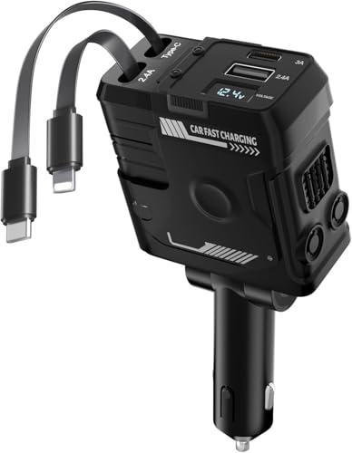シガーソケット4in1巻き取り式充電器。80cmの急速充電ケーブル2本、LED表示電圧、Type-C66W/Lightning20W対応。高温・電流・電圧保護機能付き、12/24V車対応で4台同時充電可能。iPhone16/15、iPad、Android、Apple Watch対応。