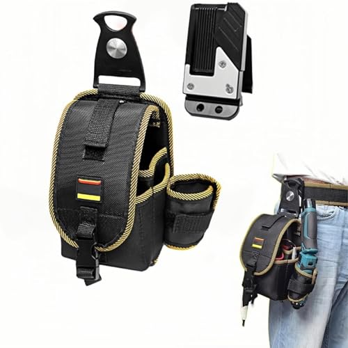 腰袋・釘袋の多機能工具ポーチ。軽量ナイロン製、着脱式ホルダー、回転フック付きで便利。防水耐久で電工・大工・DIY・釣りに最適。フタは取り外し可能。