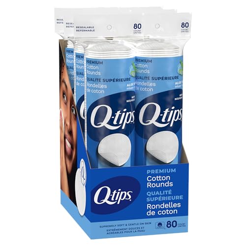 Q-Tips プレミアムコットンラウンドフェイス用パッドは、100%コットン製でソフトな使い心地。糸くずが出ず、メイクアップリムーバーやトナー、ネイルポリッシュ除去に最適。80個入りパックが6つで、スキンケアや美容に便利です。