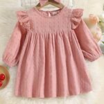 ガールズ用長袖ドレス。無地デザインでクルーネック。カジュアルな衣装で、子供や幼児、赤ちゃん向け。カラーはピンク。サイズは9-18ヶ月。