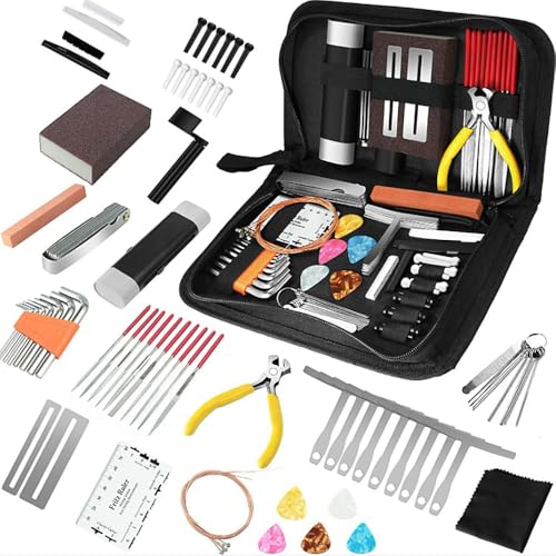 79点セットのギターメンテナンスキットは、修理ツールやクリーニング用品、測定ツールを含む充実の内容。六角レンチ、マルチスパナ、ブリッジピンなども揃い、収納袋付きで便利です。