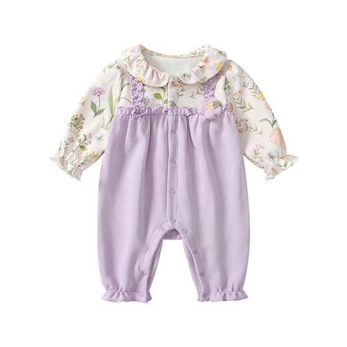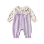 Babykoiの長袖ロンパースは新生児向けのフェイクレイヤードデザインで、春秋にぴったり。花柄のパープルで女の子に最適な出産準備や贈り物におすすめ。サイズは12M。