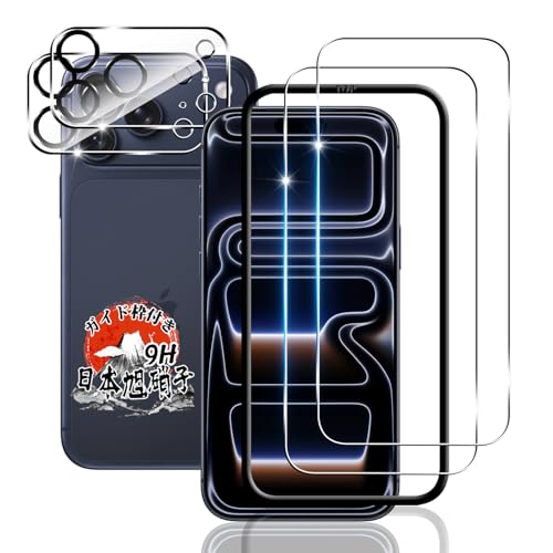 iPhone 17 Pro用のガラスフィルム2枚とカメラフィルム2枚のセット。ガイド枠付き、国産AGC旭硝子素材を使用。9H硬度、全面保護、耐衝撃で飛散防止。超薄型、高透過率、自動吸着、気泡ゼロ。ケースに干渉せず簡単に貼り付け可能。