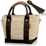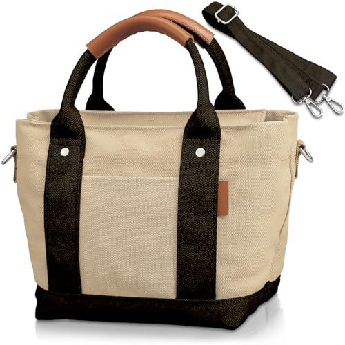 このミニトートバッグは高見え革巻きハンドルを持つキャンバス製で、男女兼用のデザイン。自立する軽量仕様で、ファスナー付きの仕切りあり。2WAYの使用が可能で、ブラックとベージュの2色展開。