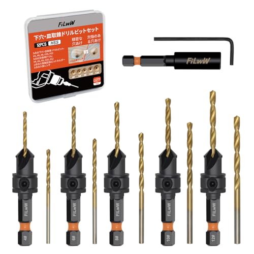 FiLwWの下穴・皿取錐ドリルビットセットは、皿穴用のドリルビットが5本(2.0, 2.4, 2.8, 3.2, 3.6mm)と1/4インチ六角軸を採用。木工用に最適で、取り替え簡単なレンチ付き。