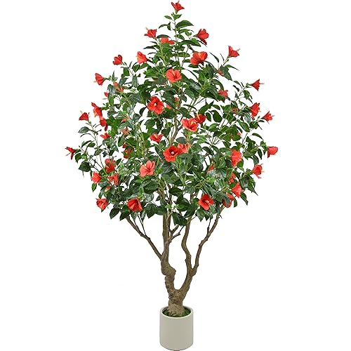 7フィートの人工ハイビスカス木。リアルな葉と62本の赤い花を持つ。大きな幹で86インチ。屋内外で使用可能なフェイクブルーミングツリー。ホワイトプランター付き。