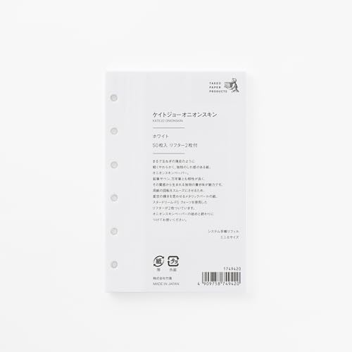 システム手帳リフィル ケイトジョーオニオンスキン ホワイトはミニ6サイズ(80×126mm)で、6穴無地タイプのリフィルです。1パックに50枚入りで、柔らかな手触りと耐久性が特徴です。