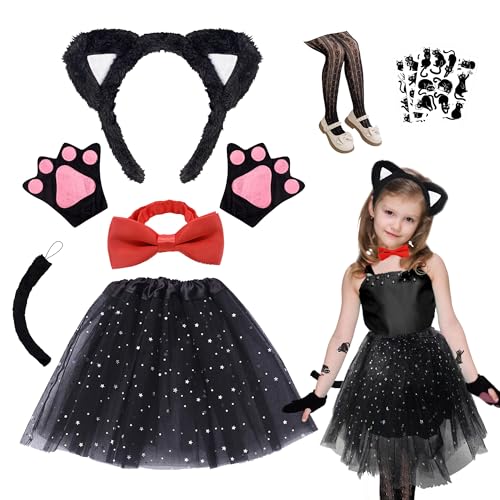 ハロウィン向けの子供用黒猫コスプレ7点セット。猫耳、小悪魔、魔女のアクセサリーが含まれ、学園祭やイベント、写真撮影に最適。レースタイツ付きで可愛らしさ満点!