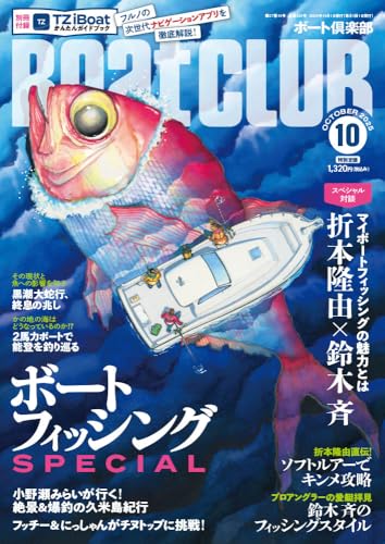 BoatCLUB 2025年10月号は折本隆由×鈴木斉の対談、折本のソフトルアーでキンメダイ、鈴木の愛艇拝見、久米島紀行、チヌトップ特集、マイボートでイカメタルなど、釣り祭りの内容が満載のボートフィッシングSPECIALです。