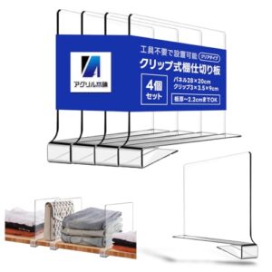 アクリル本舗 収納 仕切り パネル 棚 パーテーション オーガナイザー クローゼット 本棚 整理 整頓 隔断 (クリア, 4個セット)