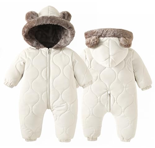 新生児用の厚手ロンパース。ふわふわ素材で保温性抜群。フード付きの可愛いクマ耳デザイン。男の子・女の子両用。前開きで便利。秋冬のアウトドアにも最適で、出産祝いにもぴったりのアイボリー色。