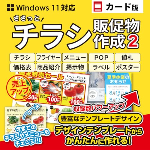ささっとチラシ販促物作成2 カード版は、チラシやPOP、掲示物、商品メニュー表などを簡単に作成・印刷できるソフトです。PDF出力も可能で、売上アップやコストカットに最適です。