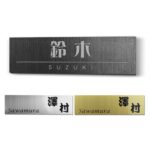 金属製のシンプルな表札で、屋外対応のレーザー彫刻加工。ステンレス調デザインの長方形プレートは、サイズ4x15cm。UV印刷で耐久性抜群。玄関やオフィスのネームプレートに最適。