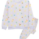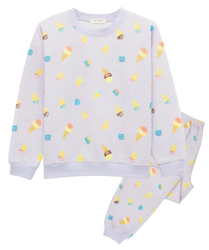 パジャマ 女の子用キッズキルト長袖。表裏綿100%で肌に優しく、かぶりタイプ。可愛いクマとアイス柄プリントの長ズボン付き。冬秋に最適なルームウェア。