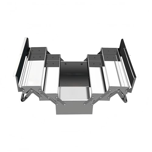 Zekonoの大型折り畳み式ツールボックスは、丈夫な鏡面ステンレス製で、3段5トレイの大容量収納。内部連動、取っ手付、カンチレバーのロックホール付きで、ポータブルかつ多機能な設計です。