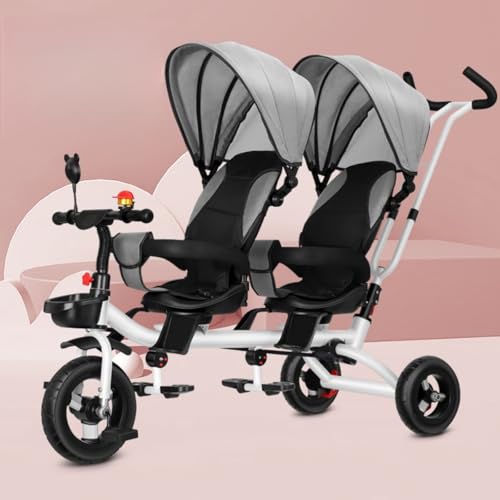 【Banefu】双子用三輪車、 二人乗り、タンデム自転車、双子用ベビーカー、回転式、サンキャノピー調節可能、背もたれ調節可能、耐衝撃フレーム、耐荷重100kg、対象年齢1~5歳 乗用玩具 誕生日 プレゼント ギフ (グレーチタンホイール)