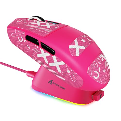 MAMBASNAKEの無線ゲーミングマウス。磁気充電ドック付きで、RGB充電スタンド使用。3モード対応、重量59g、25000DPI、1KHzで高耐久。500mAhバッテリー搭載で長持ち。