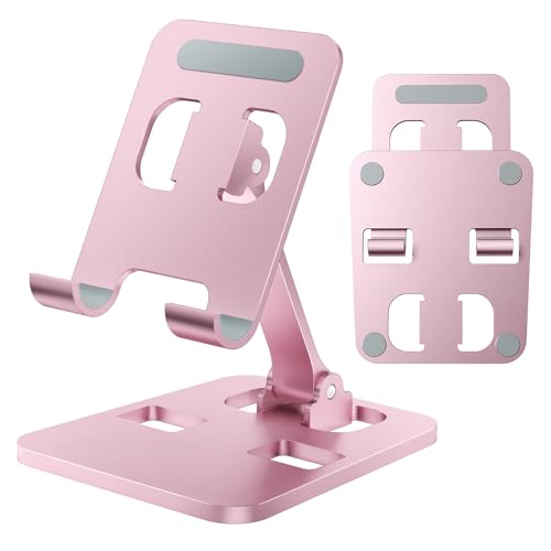 Anifrimのデュアル折りたたみ携帯電話ホルダーは耐久性のアルミニウム合金製。コンパクトで軽量、デスクやゲーム、ビデオ鑑賞に最適。全スマートフォン対応、ブラックとローズゴールドのスタイリッシュなデザイン。