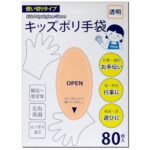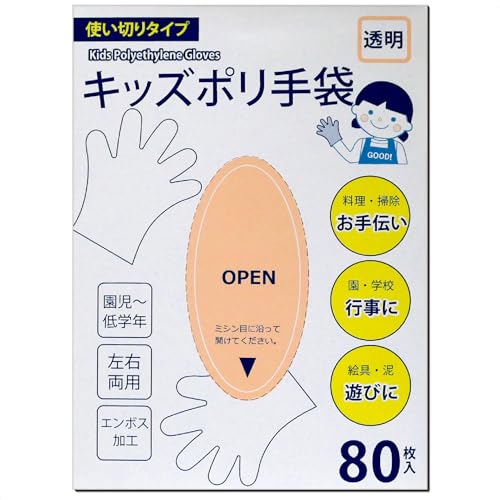 キッズポリ手袋は、透明で使い捨てタイプの手袋です。1パックに80枚入り。お子様の食事や工作、掃除など、様々な用途に利用でき、安全で安心な素材を使用しています。