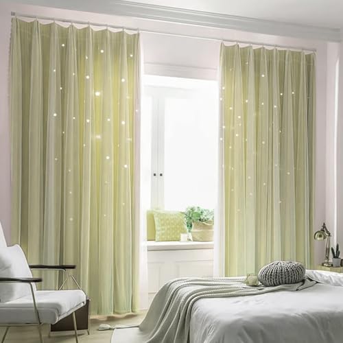 HNKLIFEの姫系遮光二重カーテンは、星柄のレース付きでおしゃれ。遮熱・保温・遮像効果があり、可調フック付きで取り付け簡単。洗濯可能で、110cm幅×110cm丈、ライトグリーン。子供部屋や寝室に最適。