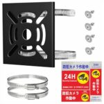 穴あけ不要の防犯カメラ取付金具です。円柱・角柱に対応したフルセットで、ステンレスバンド2本、ボルト4式、拡大版防犯ステッカー3枚が付属。安全性を高めるための便利なアイテムです。