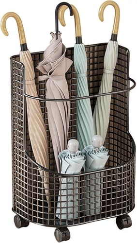 Ghbunuz傘立ては、スリムなデザインの鉄製でスタイリッシュ。可動式で滑車付き、防水・防錆機能を備え、大容量で安定感があります。北欧風のデザインが家の入り口に最適で、省スペースに配慮されています。