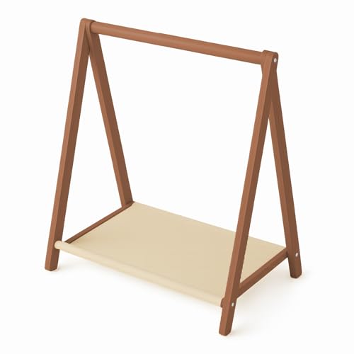 木製の子供用ハンガーラックです。自立型で洋服掛けに最適。棚付きでおしゃれなデザイン。家庭用や幼稚園のギフトにもおすすめです。(ブラウン)