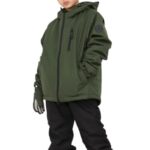 スノーボードウェア キッズ ジュニア用上下セット。サイズ調節可能で、超撥水YUK加工。耐水圧10000mmで、撥水性に優れたカーキとブラックのデザイン。