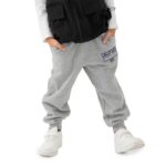 キッズの裏毛スウェットパンツ。綿100%で着心地良好。男の子にも女の子にも適しており、ロゴデザインが特徴的。サイズ14451281-110GY。
