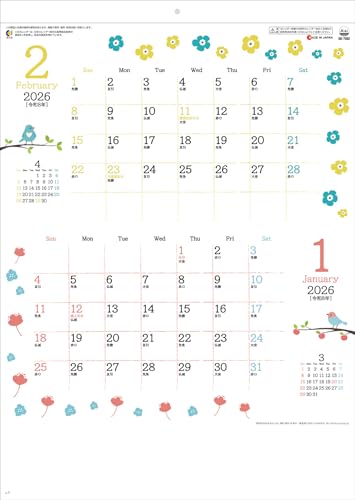 2026年1月始まりの壁掛カレンダー SG7002は、Blooming Birdデザインの2マンスタイプで、ミシン目入りです。シンプルでおしゃれなデザインが魅力です。