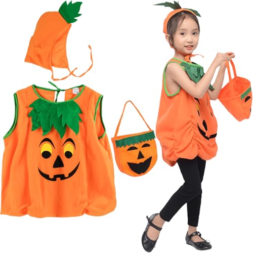 ハロウィンの子供用カボチャコスチューム。3点セット(帽子・バッグ付き)で、可愛いデザイン。幼稚園や文化祭に最適。130cmサイズ。男の子・女の子どちらにもおすすめ!