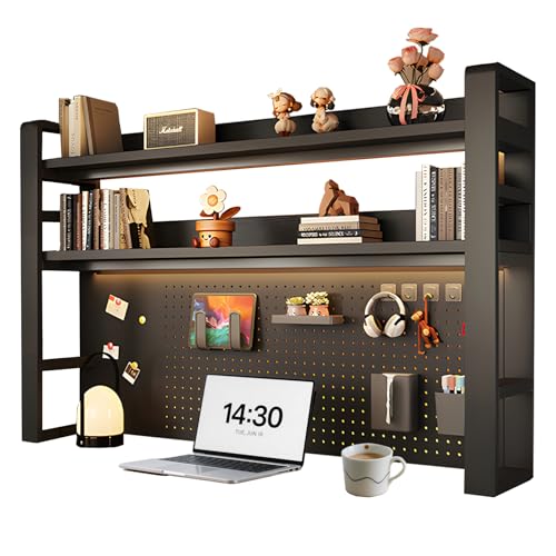 机上ラックは有孔ボード付きの多機能卓上ラックです。2段構造で幅115×奥行25×高さ93cm、大容量で文房具や事務用品を収納可能。組み立て簡単でおしゃれなブラックデザイン。
