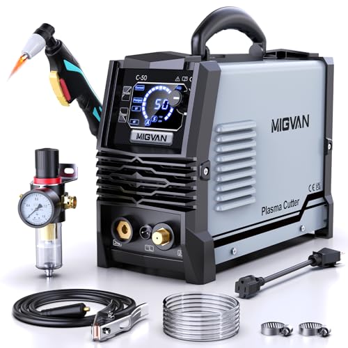 MIGVAN プラズマカッター C-50は、100V・200V兼用で、50A出力・最大切断厚12mm。使用率60%、高周波数インバータ搭載、軽量・DIY向け。LED液晶表示、日本語取扱説明書付き。