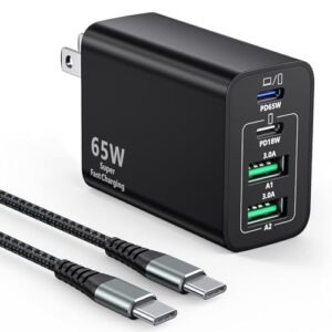 65W USB C充電器 タイプC GaN 急速充電器 4ポート搭載 コンパクトPDプラグ [2x USBC+2x USBA] 壁掛けソケット 最大4台同時充 PSE技術規格準拠 PD3.0/QC3.0/PPS高速充電 MacBook/タブレット/ノートパソコン/iPad/iPhone/Androidなど様々なデバイスに対応 2MのUSB-Cケーブルが付属する